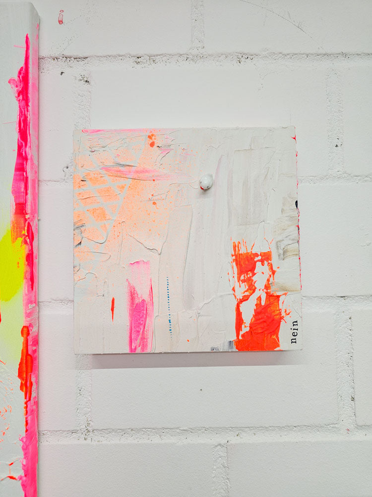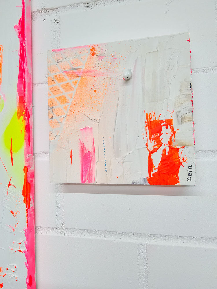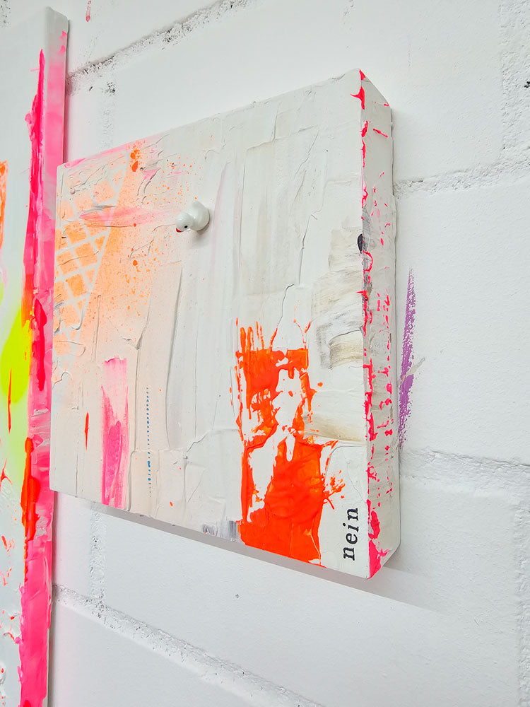 Mit dieser Kollektion widme ich mich der Kraft des Widerstands – bunt, laut und verspielt.Kleine gelbe Entchen treffen auf dicke Farbschichten, flirrendes Neon auf stille Leere. Jedes Bild sagt „Nein“ – zu Fake News, zu Grenzüberschreitungen, zum ewigen Funktionieren. Und vielleicht auch mal zu dir selbst, wenn du es brauchst. Wann hast du das letzte Mal Ja gesagt, obwohl du eigentlich Nein meintest?